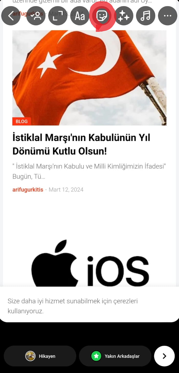 Eğer hikayenize bu üç özelliğide kullanırsanız hikayeniz görseldeki gibi olacaktır. Çıkartmaların yerlerini dilediğiniz yere sürükleyebilirsiniz.